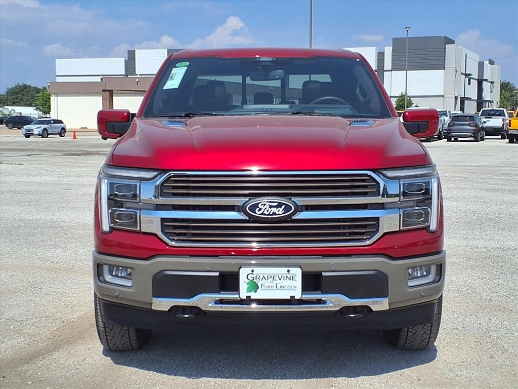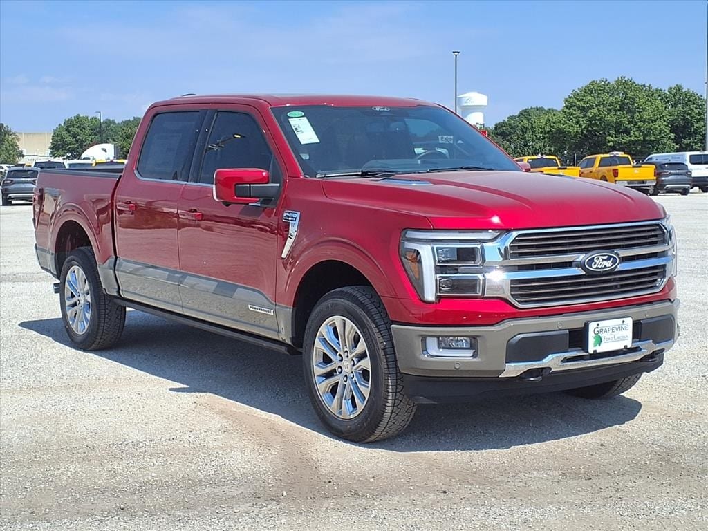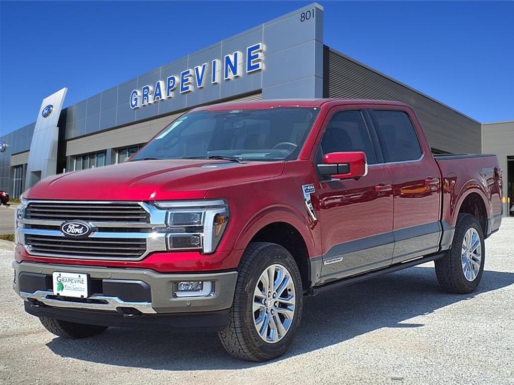 2025 Ford F-150 King Ranch Red Metallic 4WD 14 Speakers, 4-Wheel Disc Brakes, 4x4 FX4 Off-Road Bodyside Decal, ABS brakes, Air Conditioning, Automatic temperature control, Dual front impact airbags, Dual front side impact airbags, Electronic Locking w/3.55 Axle Ratio, Emergency communication system: SYNC 4 911 Assist, Equipment Group 601A High, Front anti-roll bar, Front dual zone A/C, Front wheel independent suspension, FX4 Off-Road Package, Heads-Up Display, Hill Descent Control, Low tire pressure warning, Memory seat, Monotube Rear Shocks, Navigation system: Connected Navigation, Occupant sensing airbag, Off-Road Tuned Front Shock Absorbers, Overhead airbag, Pedal memory, Power driver seat, Power moonroof, Power steering, Power windows, Radio data system, Rear window defroster, Remote keyless entry, Rock Crawl Mode, Steering wheel memory, Steering wheel mounted audio controls, Traction control. 3.5L PowerBoost Full-Hybrid V6 10-Speed Automatic Grapevine Ford Lincoln proudly serving the following communities. Grapevine, Southlake, Flower Mound, Coppell, Colleyville, Dallas, Ft Worth, Lewisville, Keller, Carrollton, The Colony, Frisco, Plano, Euless. We also serve customers in Argyle, Denton, Trophy Club, Northlake, Little Elm, Sanger, Murphy, Mesquite, DeSoto, Addison, Farmers Branch, University Park, Highland Park, Duncanville, Princeton, Prosper, Allen, Celina, and Farmersville. Some other cities include Fairview, Garland, Lucas, Irving, and Keller. We're right by DFW AIRPORT!