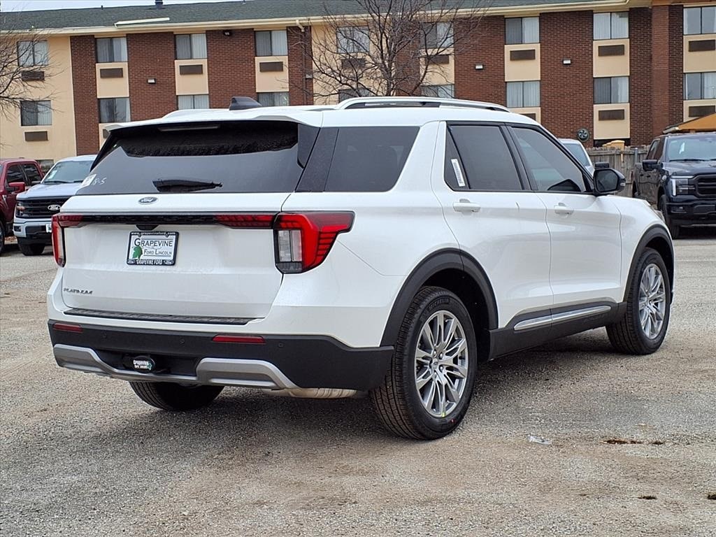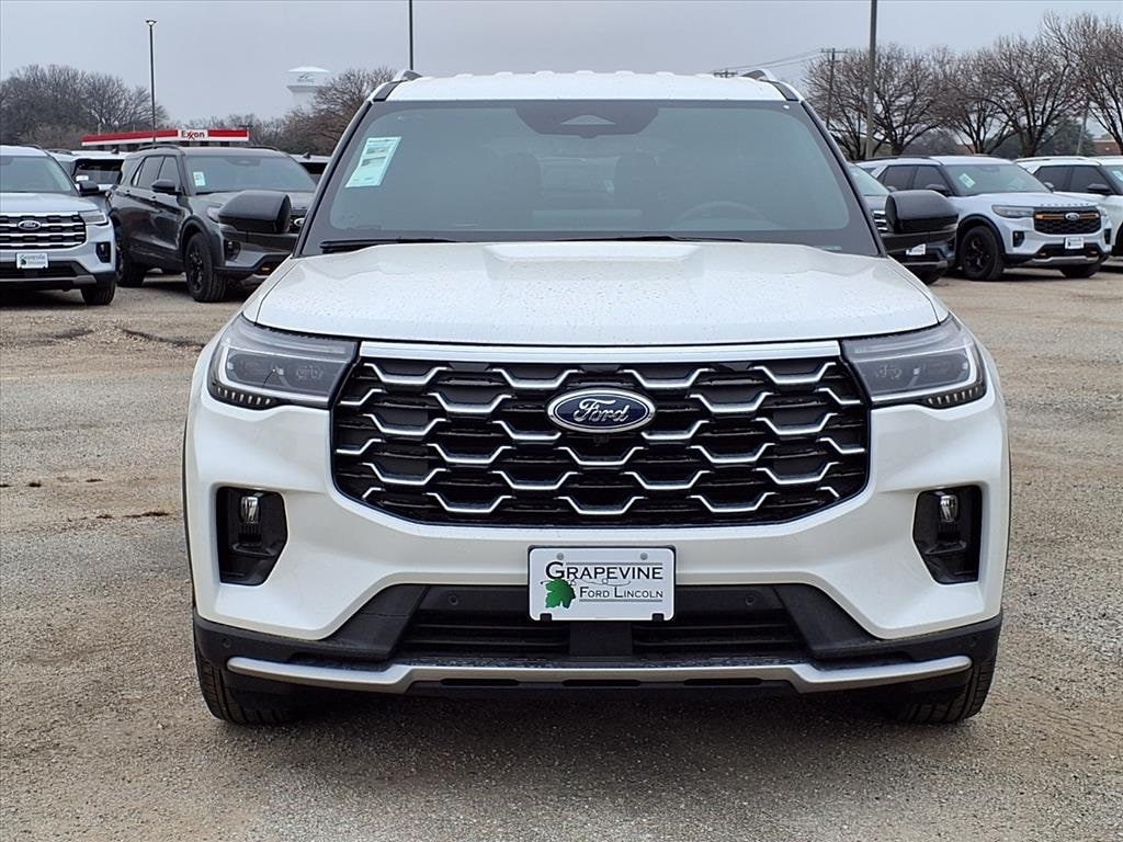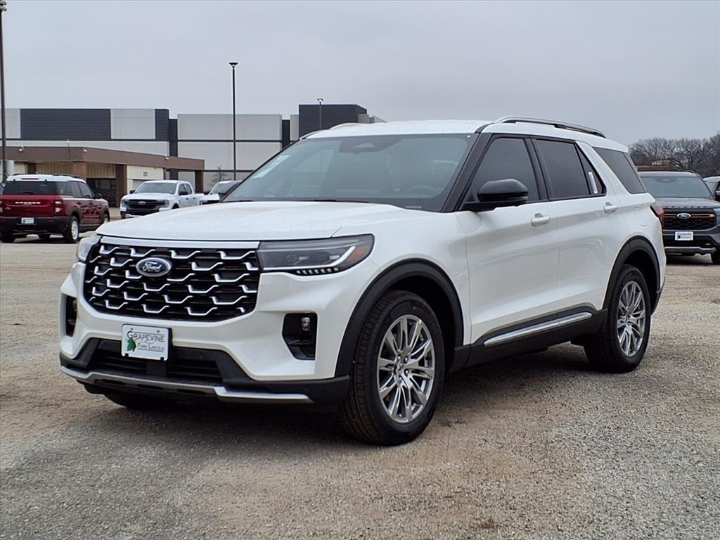 2026 Ford Explorer Platinum White RWD 14 Speakers, 4-Wheel Disc Brakes, ABS brakes, ActiveX Trimmed Captain's Chairs, Air Conditioning, Auto High-beam Headlights, Automatic temperature control, Brake assist, Delay-off headlights, Dual front impact airbags, Dual front side impact airbags, Electronic Stability Control, Emergency communication system: 911 Assist, Equipment Group 600A Standard Package, Four wheel independent suspension, Front anti-roll bar, Front dual zone A/C, Front fog lights, Fully automatic headlights, Knee airbag, Low tire pressure warning, Memory seat, Navigation System, Occupant sensing airbag, Overhead airbag, Power driver seat, Power Liftgate, Power steering, Power windows, Radio data system, Radio: B&O Sound System by Bang & Olufsen with HD, Rear air conditioning, Rear anti-roll bar, Rear window defroster, Remote keyless entry, SecuriCode Keyless Entry Keypad, Speed-sensing steering, Steering wheel mounted audio controls, Traction control, Wheels: 20" Luster Nickel-Painted Aluminum. 2.3L EcoBoost I-4 10-Speed Automatic Grapevine Ford Lincoln proudly serving the following communities. Grapevine, Southlake, Flower Mound, Coppell, Colleyville, Dallas, Ft Worth, Lewisville, Keller, Carrollton, The Colony, Frisco, Plano, Euless. We also serve customers in Argyle, Denton, Trophy Club, Northlake, Little Elm, Sanger, Murphy, Mesquite, DeSoto, Addison, Farmers Branch, University Park, Highland Park, Duncanville, Princeton, Prosper, Allen, Celina, and Farmersville. Some other cities include Fairview, Garland, Lucas, Irving, and Keller. We're right by DFW AIRPORT! Price includes: $1000 - SUV Spike Retail Bonus Cash $2500 - Retail Customer Cash