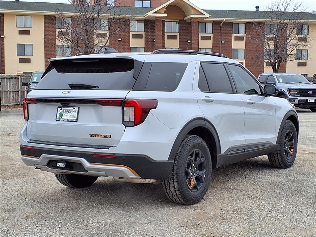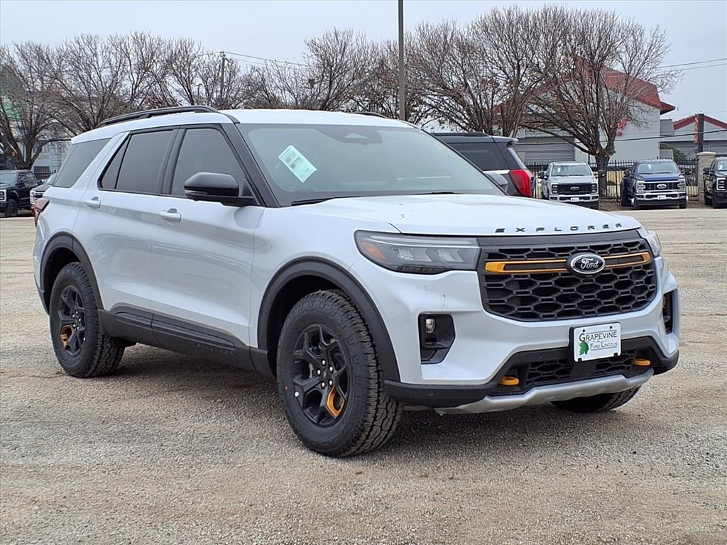 2026 Ford Explorer Tremor White Metallic 4WD 10 Speakers, 3rd Row PowerFold Seats, 4-Wheel Disc Brakes, ABS brakes, Air Conditioning, Ambient Lighting, Auto-Dimming Interior Rear-View Mirror, Automatic temperature control, Dual front impact airbags, Dual front side impact airbags, Emergency communication system: 911 Assist, Equipment Group 800A Standard Package, Four wheel independent suspension, Front anti-roll bar, Front dual zone A/C, Heated/Ventilated Miko Suede Captain's Chairs, Knee airbag, Low tire pressure warning, Manual-Folding Sideview Mirrors, Memory Driver's Seat, Navigation System, Occupant sensing airbag, Overhead airbag, Power driver seat, Power steering, Power windows, Radio: B&O Sound System by Bang and Olufsen, Rain-Sensing Wipers (front Only), Rear air conditioning, Rear anti-roll bar, Rear window defroster, Remote keyless entry, Speed-sensing steering, Steering wheel mounted audio controls, Traction control, Tremor Convenience Package, Wheels: 18" High Gloss Black-Painted Aluminum. 2.3L EcoBoost I-4 10-Speed Automatic Grapevine Ford Lincoln proudly serving the following communities. Grapevine, Southlake, Flower Mound, Coppell, Colleyville, Dallas, Ft Worth, Lewisville, Keller, Carrollton, The Colony, Frisco, Plano, Euless. We also serve customers in Argyle, Denton, Trophy Club, Northlake, Little Elm, Sanger, Murphy, Mesquite, DeSoto, Addison, Farmers Branch, University Park, Highland Park, Duncanville, Princeton, Prosper, Allen, Celina, and Farmersville. Some other cities include Fairview, Garland, Lucas, Irving, and Keller. We're right by DFW AIRPORT! Price includes: $1000 - SUV Spike Retail Bonus Cash $2500 - Retail Customer Cash