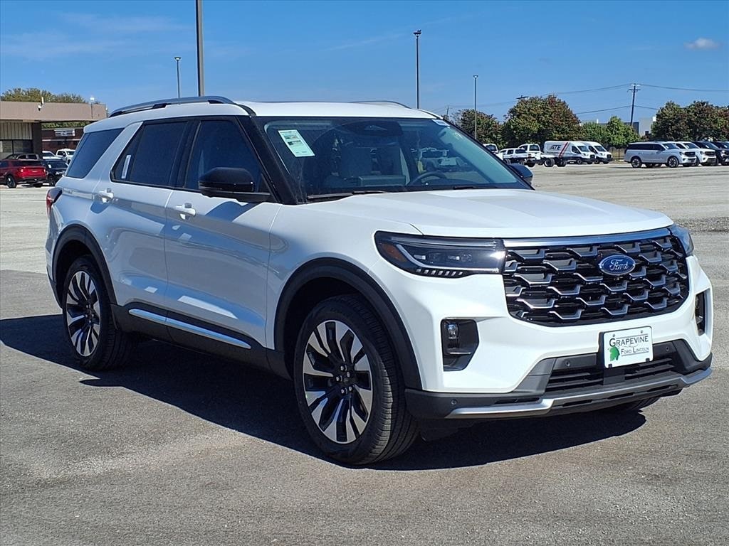 2026 Ford Explorer Platinum White 4WD 14 Speakers, 4-Wheel Disc Brakes, ABS brakes, Air Conditioning, Auto High-beam Headlights, Automatic temperature control, Brake assist, Delay-off headlights, Dual front impact airbags, Dual front side impact airbags, Electronic Stability Control, Emergency communication system: 911 Assist, Equipment Group 600A Standard Package, Exterior Parking Camera Rear, Four wheel independent suspension, Front anti-roll bar, Front dual zone A/C, Front fog lights, Fully automatic headlights, Knee airbag, Low tire pressure warning, Lux Leather Package, Memory seat, Navigation System, Occupant sensing airbag, Overhead airbag, Panic alarm, Panoramic Fixed Glass Roof w/Power Shade, Platinum Badges on Front Row Seats, Power driver seat, Power Liftgate, Power steering, Power windows, Premium Leather Seating Surfaces Captain's Chairs, Quilting & Stitching on Door Panels, Quilting & Stitching on Seats, Radio data system, Radio: B&O Sound System by Bang & Olufsen w/HD, Rear air conditioning, Rear anti-roll bar, Rear window defroster, Remote keyless entry, SecuriCode Keyless Entry Keypad, Security system, Speed-sensing steering, Steering wheel mounted audio controls, Traction control. 2.3L EcoBoost I-4 10-Speed Automatic Grapevine Ford Lincoln proudly serving the following communities. Grapevine, Southlake, Flower Mound, Coppell, Colleyville, Dallas, Ft Worth, Lewisville, Keller, Carrollton, The Colony, Frisco, Plano, Euless. We also serve customers in Argyle, Denton, Trophy Club, Northlake, Little Elm, Sanger, Murphy, Mesquite, DeSoto, Addison, Farmers Branch, University Park, Highland Park, Duncanville, Princeton, Prosper, Allen, Celina, and Farmersville. Some other cities include Fairview, Garland, Lucas, Irving, and Keller. We're right by DFW AIRPORT! Price includes: $1000 - Retail Customer Cash