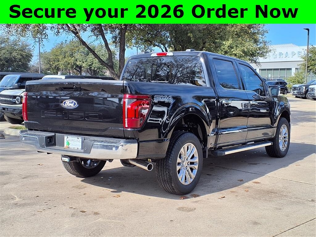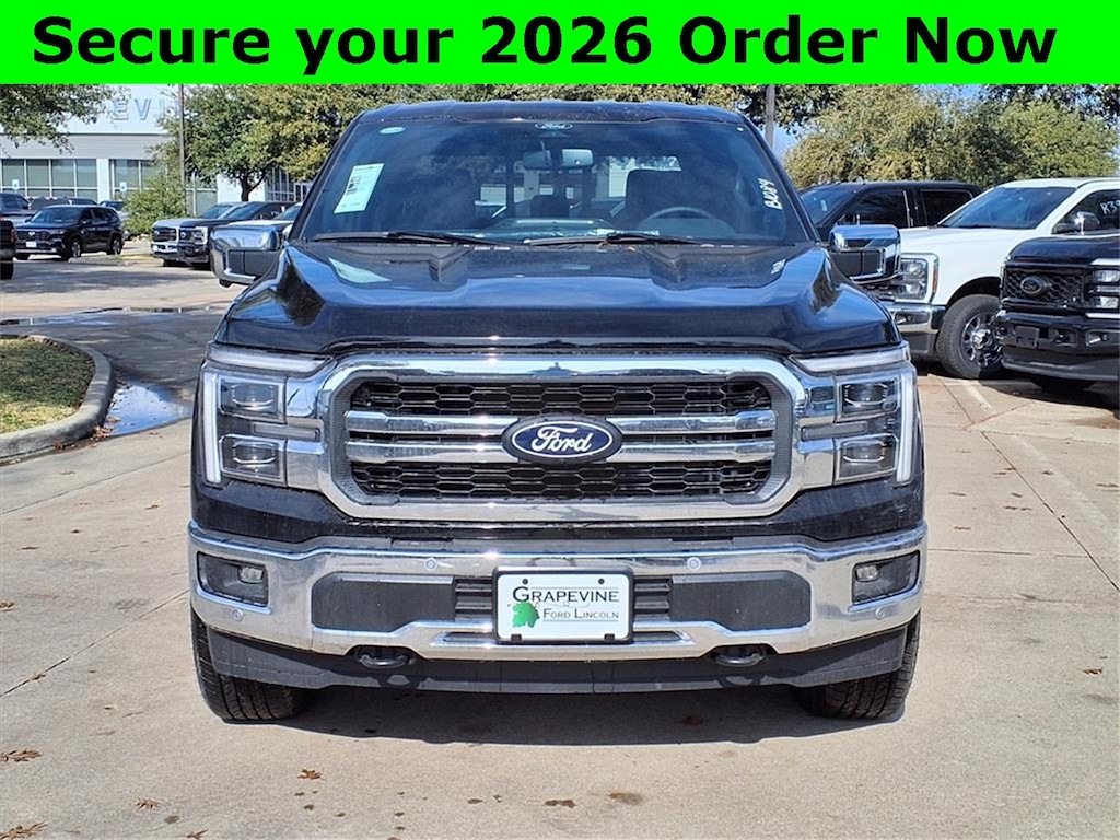 2026 Ford F-150 Lariat Black Metallic 4WD 4-Wheel Disc Brakes, 4x4 FX4 Off-Road Bodyside Decal, 6" Angular Bright Anodized Step Bar, 8 Speakers, ABS brakes, ActiveX Trimmed Bucket Seats, Air Conditioning, Automatic temperature control, Brake assist, Driver's Side SecuriCode Keyless-Entry Keypad, Dual front impact airbags, Dual front side impact airbags, Electronic Locking with 3.31 Axle Ratio, Electronic Stability Control, Emergency communication system: SYNC 4 911 Assist, Equipment Group 501A Mid, Ford Connectivity Package (1-Year Included), Front anti-roll bar, Front dual zone A/C, Front wheel independent suspension, FX4 Off-Road Package, Hill Descent Control, Illuminated Driver and Passenger Visors, Internet access capable: 5G Modem - Ford Connectivity Package, Low tire pressure warning, Memory seat, Monotube Rear Shocks, Navigation system: Connected Navigation, Occupant sensing airbag, Off-Road Tuned Front Shock Absorbers, Overhead airbag, Power driver seat, Power steering, Power windows, Power-Sliding Rear Window, Radio data system, Radio: B&O Sound System by Bang and Olufsen, Rear window defroster, Remote keyless entry, Rock Crawl Mode, Steering wheel mounted audio controls, SYNC 4 with Enhanced Voice Recognition, Traction control, Tray Style Floor Liner Without Carpet Mats, Wheels: 20" Chrome-Like PVD. 5.0L V8 10-Speed Automatic Grapevine Ford Lincoln proudly serving the following communities. Grapevine, Southlake, Flower Mound, Coppell, Colleyville, Dallas, Ft Worth, Lewisville, Keller, Carrollton, The Colony, Frisco, Plano, Euless. We also serve customers in Argyle, Denton, Trophy Club, Northlake, Little Elm, Sanger, Murphy, Mesquite, DeSoto, Addison, Farmers Branch, University Park, Highland Park, Duncanville, Princeton, Prosper, Allen, Celina, and Farmersville. Some other cities include Fairview, Garland, Lucas, Irving, and Keller. We're right by DFW AIRPORT!