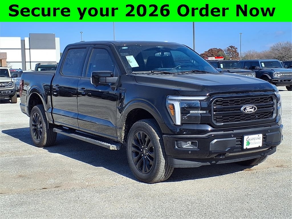 2026 Ford F-150 Lariat Black Metallic 4WD 4-Wheel Disc Brakes, 4x4 FX4 Off-Road Bodyside Decal, 6" Angular Bright Anodized Step Bar, 8 Speakers, ABS brakes, ActiveX Trimmed Bucket Seats, Air Conditioning, Automatic temperature control, Black Exterior Badging, Black Grille, Black Taillamp Bezels, Body-Color Front and Rear Bumpers, Dark Interior Appliques, Driver's Side SecuriCode Keyless-Entry Keypad, Dual front impact airbags, Dual front side impact airbags, Electronic Locking with 3.31 Axle Ratio, Emergency communication system: SYNC 4 911 Assist, Equipment Group 501A Mid, Ford Connectivity Package (1-Year Included), Front anti-roll bar, Front dual zone A/C, Front wheel independent suspension, FX4 Off-Road Package, Gray Box Side Decal, Hill Descent Control, Illuminated Driver and Passenger Visors, Internet access capable: 5G Modem - Ford Connectivity Package, Lariat Black Appearance Package, Low tire pressure warning, Matte Black Tailgate F-150 Decal, Memory seat, Monotube Rear Shocks, Navigation system: Connected Navigation, Occupant sensing airbag, Off-Road Tuned Front Shock Absorbers, Overhead airbag, Power driver seat, Power steering, Power windows, Power-Adjustable Pedals with Memory, Power-Sliding Rear Window, Radio data system, Radio: B&O Sound System by Bang and Olufsen, Rear window defroster, Remote keyless entry, Rock Crawl Mode, Steering wheel mounted audio controls, SYNC 4 with Enhanced Voice Recognition, Traction control, Tray Style Floor Liner Without Carpet Mats, Wheels: 20" Chrome-Like PVD. 5.0L V8 10-Speed Automatic Grapevine Ford Lincoln proudly serving the following communities. Grapevine, Southlake, Flower Mound, Coppell, Colleyville, Dallas, Ft Worth, Lewisville, Keller, Carrollton, The Colony, Frisco, Plano, Euless. We also serve customers in Argyle, Denton, Trophy Club, Northlake, Little Elm, Sanger, Murphy, Mesquite, DeSoto, Addison, Farmers Branch, University Park, Highland Park, Duncanville, Princeton, Prosper, Allen, Celina, and Farmersville. Some other cities include Fairview, Garland, Lucas, Irving, and Keller. We're right by DFW AIRPORT!